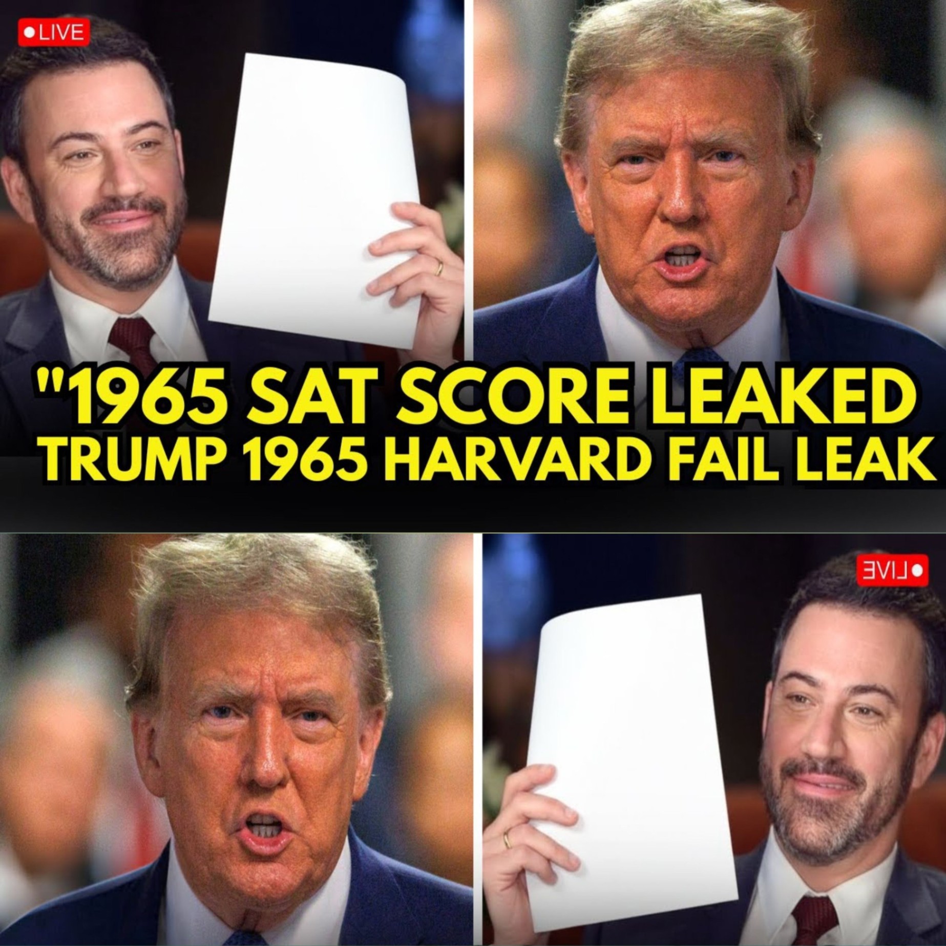 Late-night television has always thrived on surprise, spectacle, and sharp-tongued satire — but last night, Jimmy Kimmel delivered something far more explosive than a punchline. In a moment that lit up social media within minutes, Kimmel claimed to reveal a long-hidden artifact from Donald Trump’s youth: his alleged 1965 SAT scorecard. And according to the document flashed on-screen, the self-proclaimed “stable genius” scored a startling 970 out of 1600, below the national average of that year.